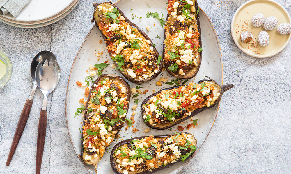 Een heerlijk vegetarisch hoofdgerecht van gevulde aubergine met couscous, feta en pijnboompitten. Ook leuk om als bijgerecht te serveren aan een grote groep mensen. De nootmuskaat maakt het gerecht helemaal af!