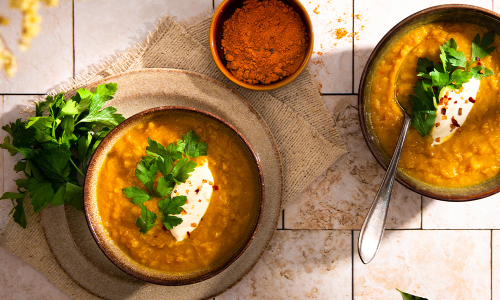 Verhit de olie in een pan en fruit de ui glazig. Voeg de World Spice Blend Ras el Hanout toe en bak 1 minuut mee. Voeg de wortelen en de rode peper toe en bak 5 minuten mee. Voeg de groentebouillon, sap van de citroen en de linzen toe en laat 30 minuten koken op middelhoog vuur. Pureer de soep totdat deze bijna glad is.